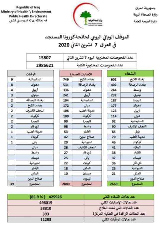 عراقيون/متابعة/ أعلنت وزارة الصحة والبيئة الموقف الوبائي اليومي لجائحة كورونا في العراق ليوم السبت الموافق ٧ تشرين الثاني ٢٠٢٠ .