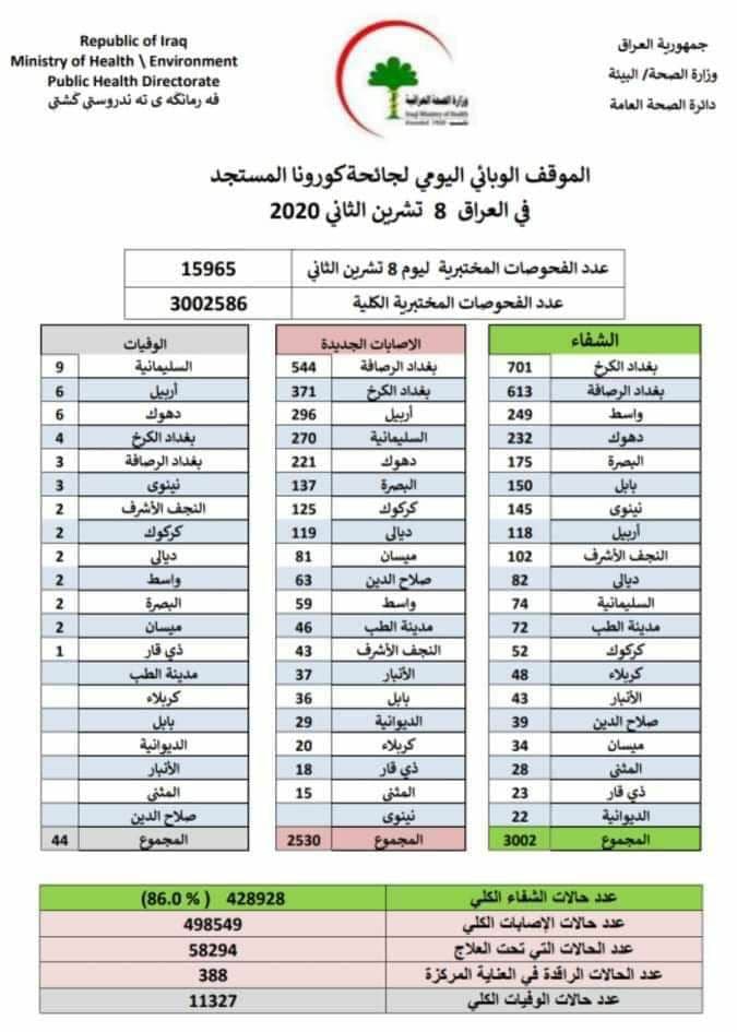 وبحسب الموقف الذي حصلت وكالة انباء /عراقيون/ ونسخة منه، فأن “عدد الإصابات 2530 حالة وعدد حالات الشفاء 3002 حالة وعدد حالات الوفاة 44 حالة”.