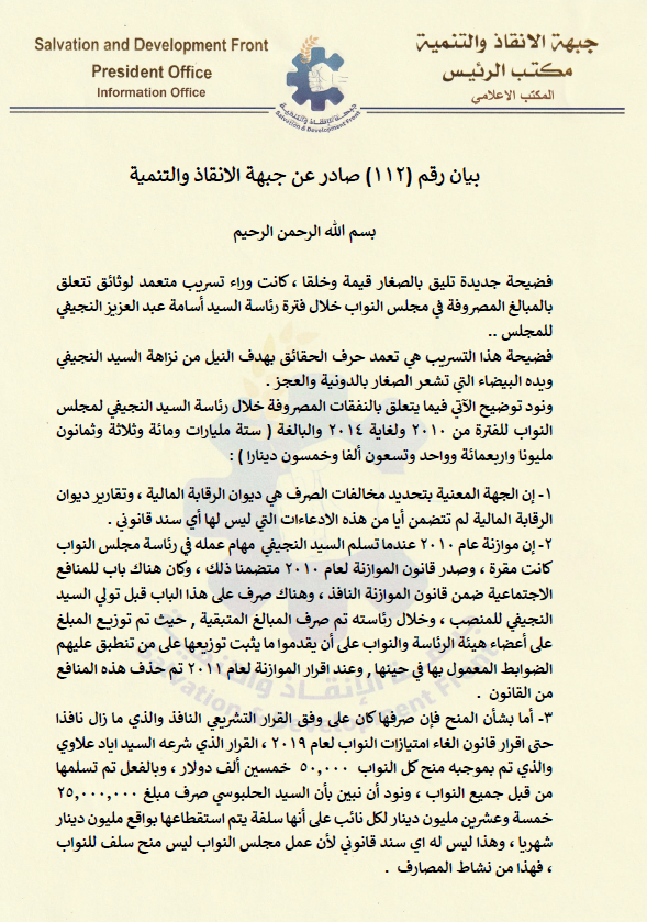 تحدثت جبهة الإنقاذ والتنمية عن اتهامات وجهت لرئيس الجبهة إسامة النجيفي فترة توليه رئاسة مجلس النواب، حول إهدار للمال العام، متهمة رئيس البرلمان الحالي محمد الحلبوسي بإنجاز مشاريع دون موافقات رسمية.