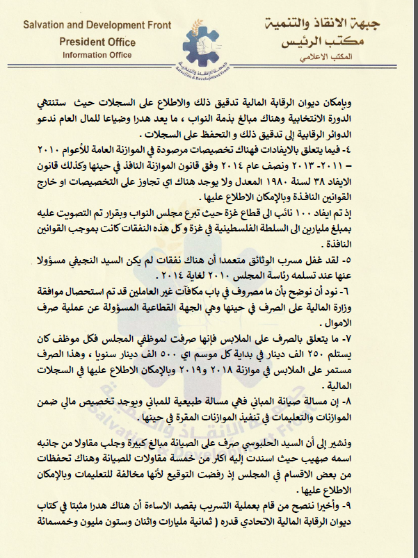 1- إن الجهة المعنية بتحديد مخالفات الصرف هي ديوان الرقابة المالية، وتقارير ديوان الرقابة المالية لم تتضمن أيا من هذه الادعاءات التي ليس لها أي سند قانوني.