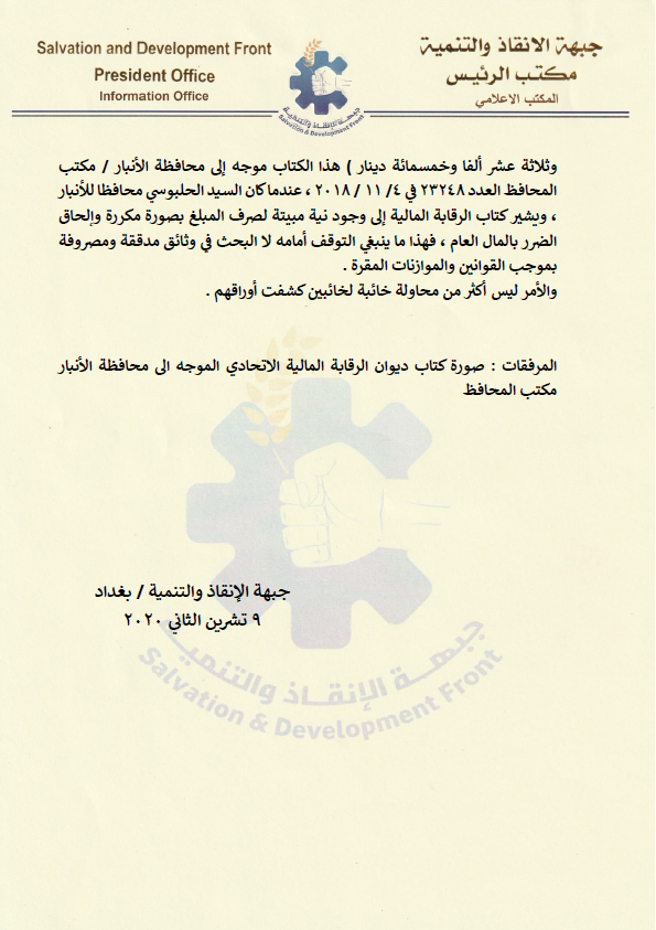 9- وأخيرا ننصح من قام بعملية التسريب بقصد الاساءة أن هناك هدرا مثبتا في كتاب ديوان الرقابة المالية الاتحادي قدره ( ثمانية مليارات واثنان وستون مليون وخمسمائة وثلاثة عشر ألفا وخمسمائة دينار ) هذا الكتاب موجه إلى محافظة الأنبار/ مكتب المحافظ العدد 23248 في 4/ 11 / 2018 ، عندما كان الحلبوسي محافظا للأنبار، ويشير كتاب الرقابة المالية إلى وجود نية مبيتة لصرف المبلغ بصورة مكررة وإلحاق الضرر بالمال العام ، فهذا ما ينبغي التوقف أمامه لا البحث في وثائق مدققة ومصروفة بموجب القوانين والموازنات المقرة.