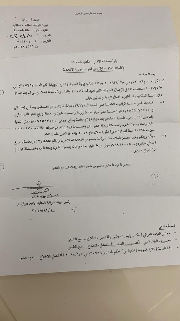 وجاء في الوثيقة التي حملت توقيع الدكتور صلاح نوري خلف رئيس ديوان الرقابة المالية الاتحادية/ وكالة آنذاك ان” الحلبوسي قدم الى هيئة الرقابة المالية في الانبار عندما كان محافظا، (٣٩٧) معاملة لأغراض التدقيق، وبملبغ اجمالي قدره (خمسة عشر مليار ومئتان وأربعة وخمسون مليون وسبعمائة واربع عشر الف دينار)، وقد تبين عند اجراء التدقيق بانها (٢٤٥) معاملة بمبلغ اجمالي (ثمانية مليار واثنان وستون مليون وخمسمائة وثلاثة عشر الف وخمسمائة دينار)، قد تم صرفها خلال سنة ٢٠١٧، مما تبين ان هناك نية مبيتة لصرفها بصورة متكررة خلال سنة ٢٠١٨”.