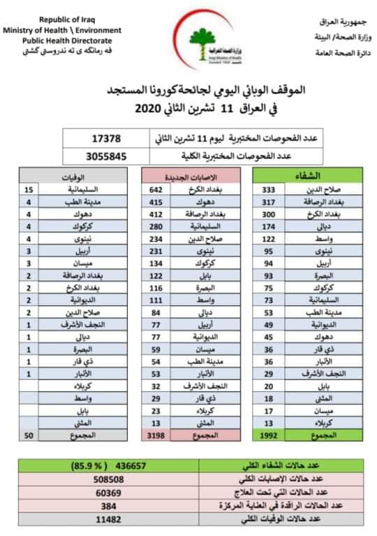 وبهذا يرتفع مجموع عدد الإصابات بفيروس كورونا في العراق إلى 508508 حالات بينها 436657 شفاء و11482 وفاة، فيما يتلقى 60369 مصاباً العلاج في المستشفيات بينهم 384 في العناية المركزة.