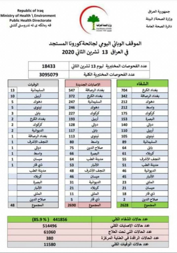عراقيون/متابعة/ أعلنت وزارة الصحة والبيئة الموقف الوبائي لفايروس كورونا في العراق اليوم الموافق 2020/11/13