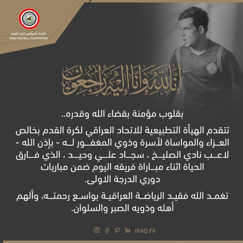 وتقدمَ رئيس الهيأة التطبيعية، إياد بنيان، والاعضاء كافة، بأحر التعازي والمواساة إلى عائلة اللاعب سجاد وحيد ومحبيه، وكذلك إلى نادي الصليخ وإلى الوسط الرياضي كافة، لرحيل موهبة كروية شابة نتيجة نوبة قلبية مفاجئة.
