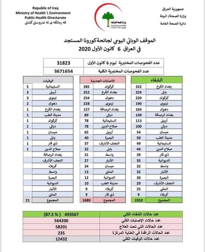 وذكرت الصحة في بيان حصلت عراقيون على نسخو منه ” تسجل 1680 إصابة جديدة ، مقابل 1910 حالة شفاء ، و 21 وفاة” .