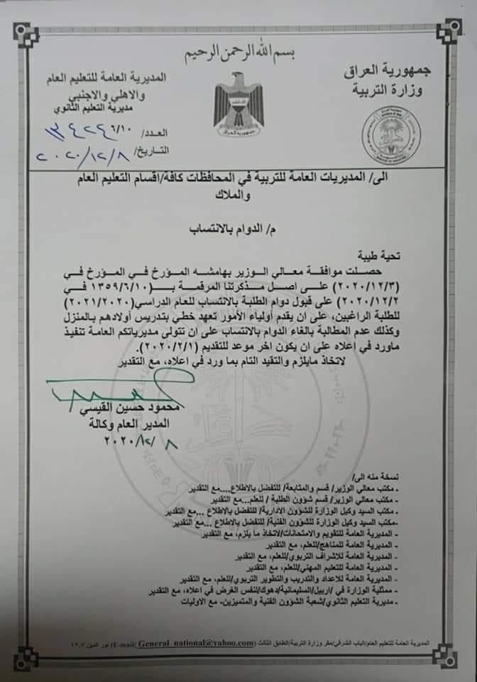 وذكر بيان للوزارة، أن “وزير التربية علي حميد الدليمي وافق على ان يكون دوام الطلبة للعام الدراسي الحالي بـ”الانتساب”.