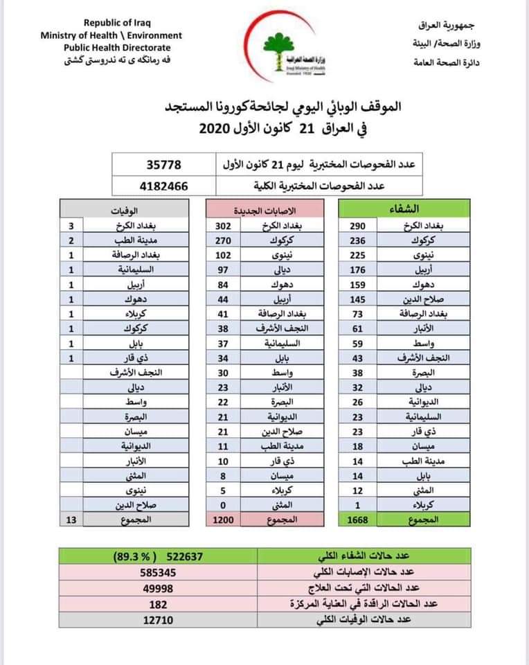 وذكرت الصحة في بيان حصلت وكالة انباء عراقيون على نسخة منه “سجلت مختبرات وزارة الصحة اليوم 1200 إصابة ، و1668 حالة شفاء ، و13 حالة وفاة .