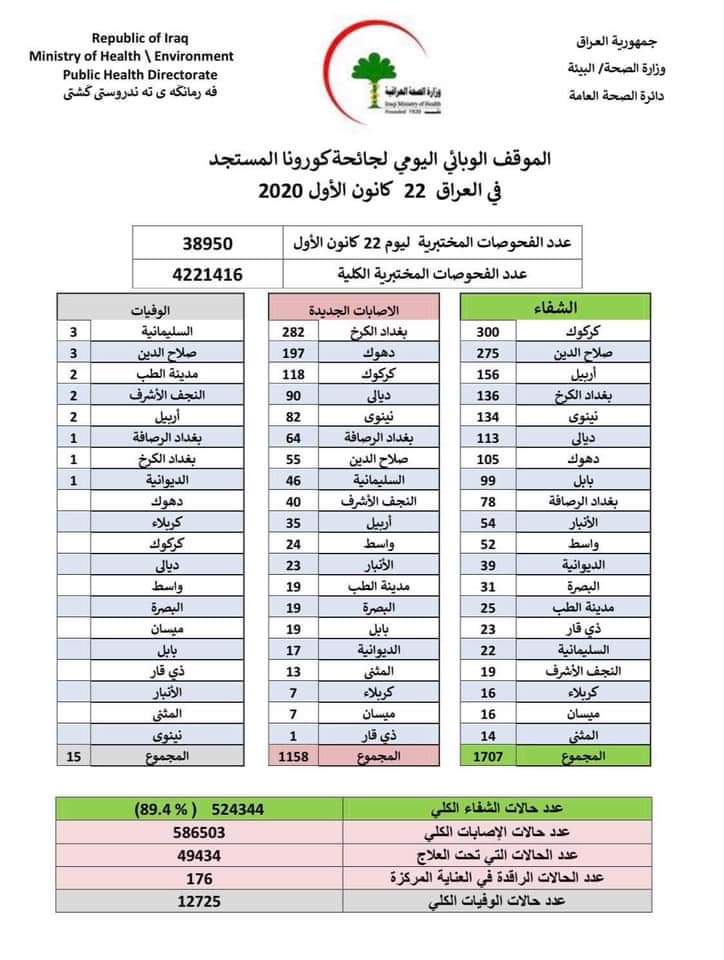 وذكرت الصحة في بيان لها حصلت وكالة انباء عراقيون على نسخة منه ” سجل مختبراتها 1158 اصابة جديدة ، و1707 حالة شفاء ، و15 حالة وفاة .