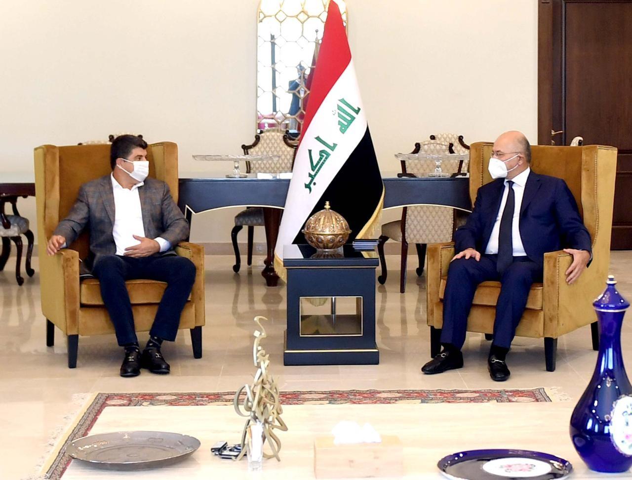 والتقى الوفد مع رئيس الجمهورية برهم صالح لبحث مستجدات الاوضاع وجهود تمرير مشروع قانون الموازنة الاتحادية لعام 2021″.