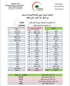 وقالت الوزارة في بيان لها ان الموقف الوبائي اليوم سجل انخفاضا كبيرا بعدد الاصابات وحالات الوفاة جراء فيروس كورونا.