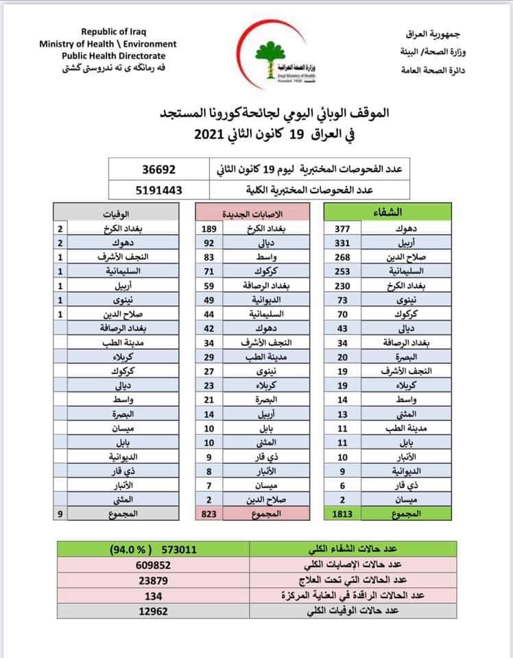 عراقيون/متابعة/ أعلنت وزارة الصحة والبيئة الموقف الوبائي اليومي لجائحة كورونا المستجد في العراق ليوم الثلاثاء الموافق ١٩ كانون الثاني ٢٠٢١.
