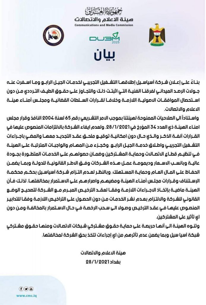 عراقيون/متابعة/ بعد اقل من يوم من اعلان اطلاقها خدمة الجيل الرابع، وجهت هيئة الاعلام والاتصالات كتاباً عاجلا الى شركة اسيا سيل اخطرتها فيه بضرورة ايقاف التشغيل التجريبي لخدمتها الجديدة.