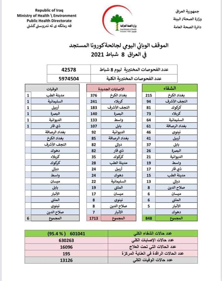 عراقيون/متابعة/ أعلنت وزارة الصحة الموقف الوبائي اليومي لجائحة كورونا المستجد في العراق ليوم الاثنين الموافق 8 شباط 2021.