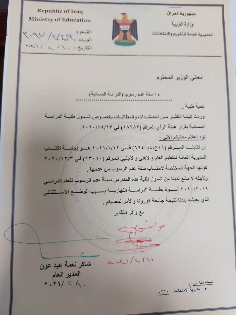 عراقيون /متابعة/ أعلنت وزارة التربية، اليوم الأربعاء، احتساب العام 2019- 2020 سنة عدم رسوب للدراسات المسائية.