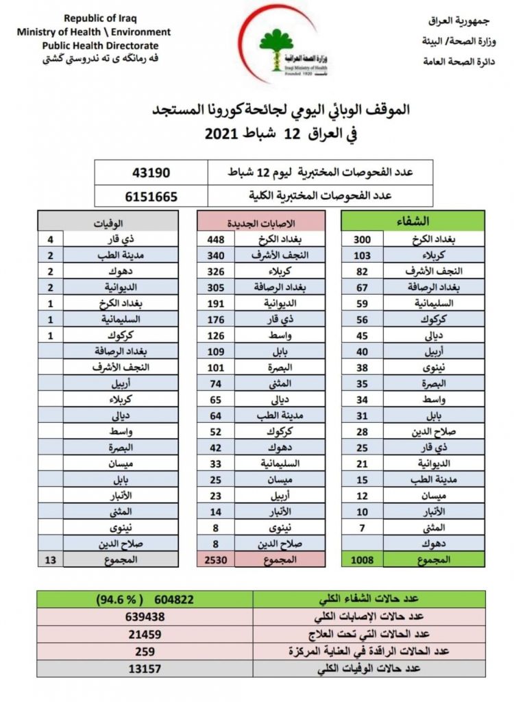 عراقيون/متابعة/ أعلنت وزارة الصحة الموقف الوبائي اليومي للإصابات المسجلة بفيروس كورونا المستجد في العراق/ الجمعة ١٢ شباط ٢٠٢١.