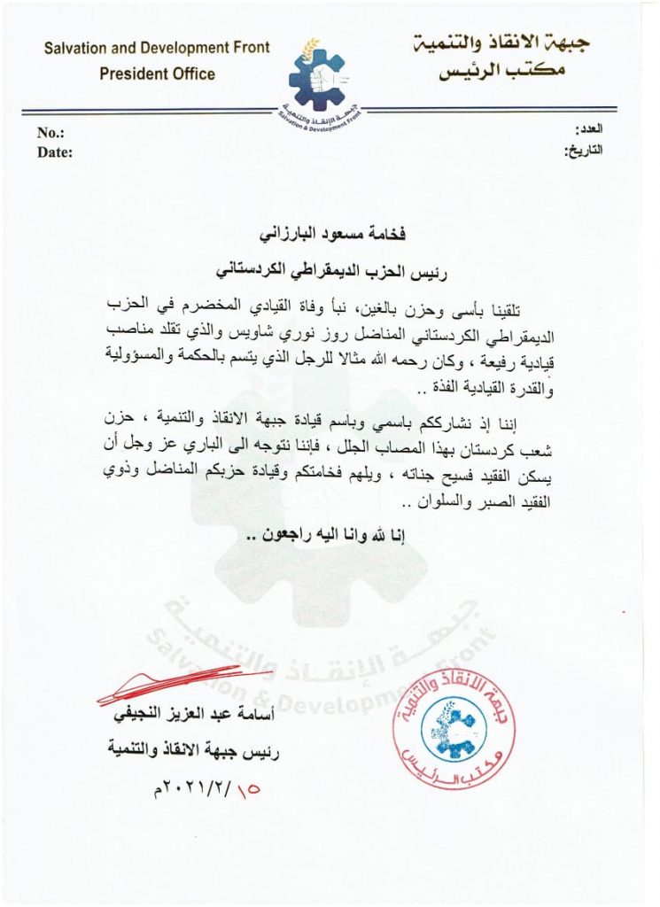 نعت جبهة الإنقاذ والتنمية زعيم الحزب الديمقراطي مسعود بارزاني بارزاني بوفاة القيادي المخضرم في الحزب روز نوري شاويس اليوم الإثنين .