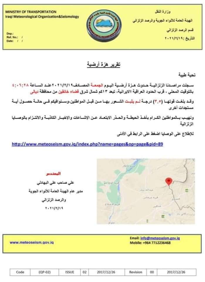 عراقيون /متابعة/ اعلنت وزارة النقل العراقية ، الجمعة ، عن تسجيل مراصدها الزلزالية في الهيأة العامة للانواء الجوية والرصد الزلزالي حدوث هزة أرضية عصر اليوم الموافق 19/ شباط / 2021 قرب الحدود العراقية الايرانية ، من محافظة ديالى .