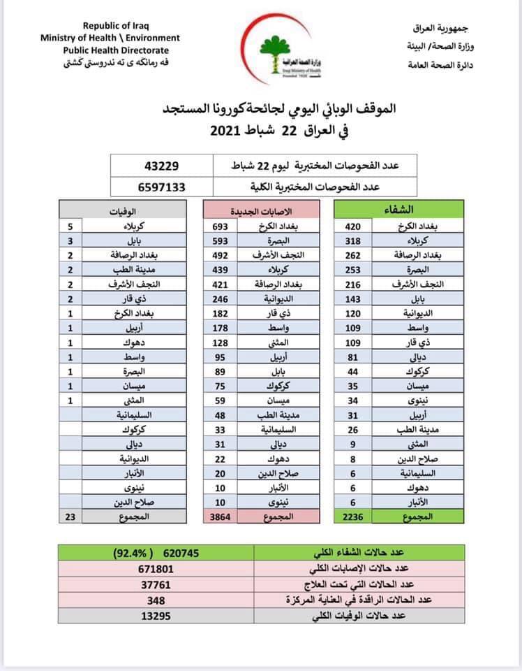 وذكرت الصحة في بيان حصلت وكالة أنباء عراقيون على نسخة “سجلت مختبراتنا هذا اليوم 3864 إصابة جديدة ، 2236 حالة شفاء ، 23 حالة وفاة”.