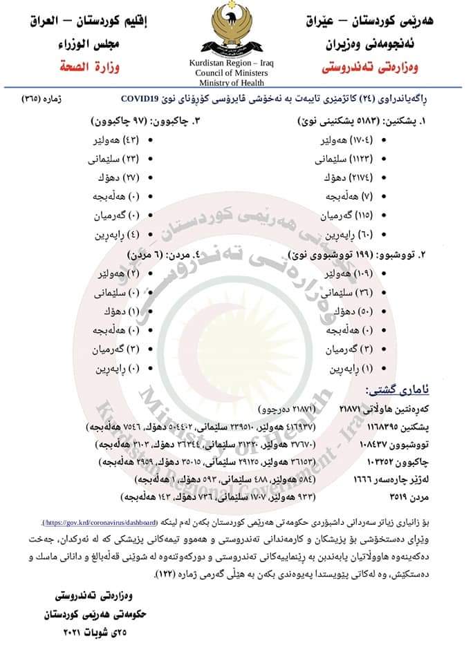 عراقيون/متابعة/ أعلنت وزارة الصحة في إقليم كوردستان الموقف الوبائي اليومي بفايروس كورونا اليوم الخميس .