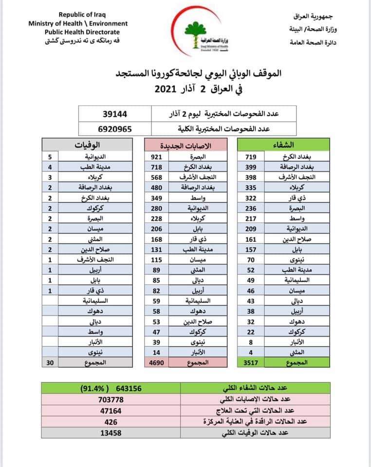 عراقيون/متابعة/ أعلنت وزارة الصحة والبيئة الموقف الوبائي اليومي لجائحة كورونا في العراق ليوم الثلاثاء الموافق 2 اذار 2021.