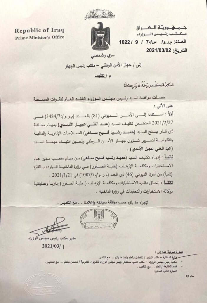 ثانيا : إنهاء تكليف السيد (حمید رشید فليح ساهي) من مهام منصب مدير عام الاستخبارات ومكافحة الإرهاب (خلية الصقور) في وزارة الداخلية الواردة بالفقرة (ثانية) من أمرنا الديواني (46) ذي العدد (م.ر .و/د 1087/ 7 ) في 2021/ 1 / 21 .