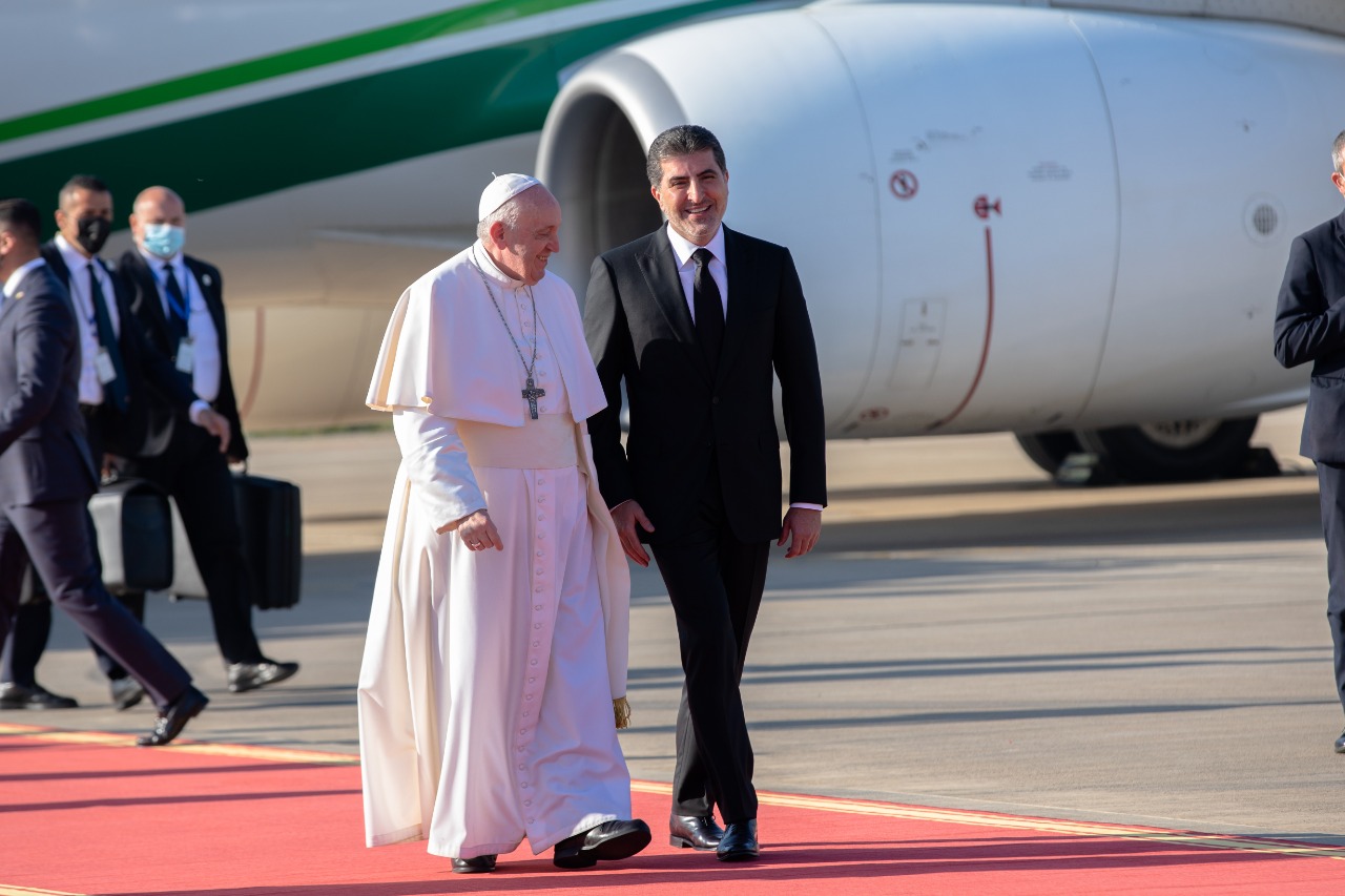 وقالت الرئاسة في بيان ، إن “بارزاني استقبل في مطار أربيل الدولي قداسة البابا فرنسيس بابا الفاتيكان، ولدى ترجله من الطائرة أشار قداسته إلى الأرض قائلاً لرئيس الاقليم يسعدني أن نلتقي من جديد هنا”.