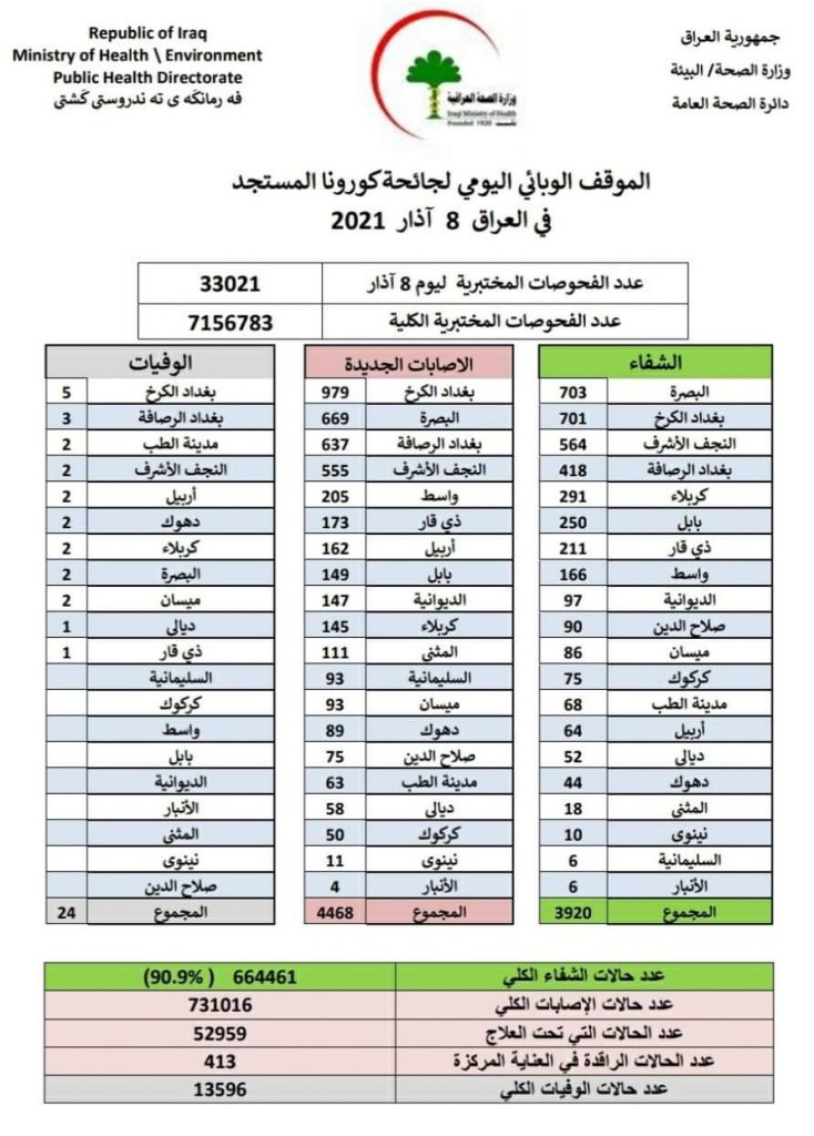 وذكرت الصحة في بيان حصلت وكالة أنباء عراقيون على نسخة منه “تم تسجيل 4468 إصابة جديدة ، و3920 حالة شفاء، و 24 حالة وفاة”.