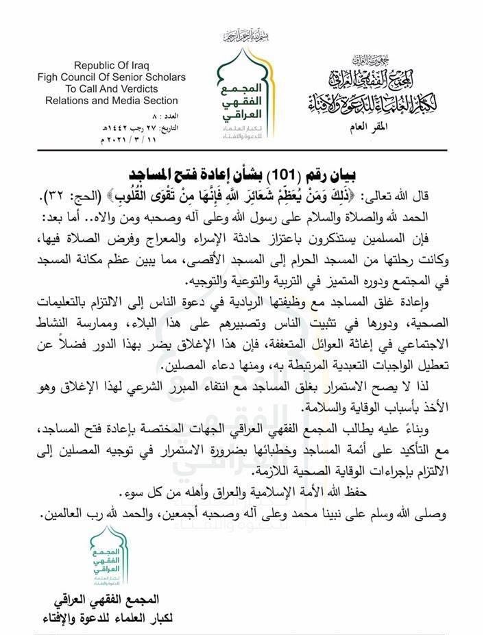 عراقيون/متابعة/ طالب المجمع الفقهي، اليوم الخميس، الجهات المختصة بإعادة فتح المساجد لـ”انتفاء المبرر الشرعي”، فيما أكد على ائمة المساجد بضرورة الاستمرار في توجيه المسلمين إلى الالتزام باجراءات الوقاية الصحية الازمة.