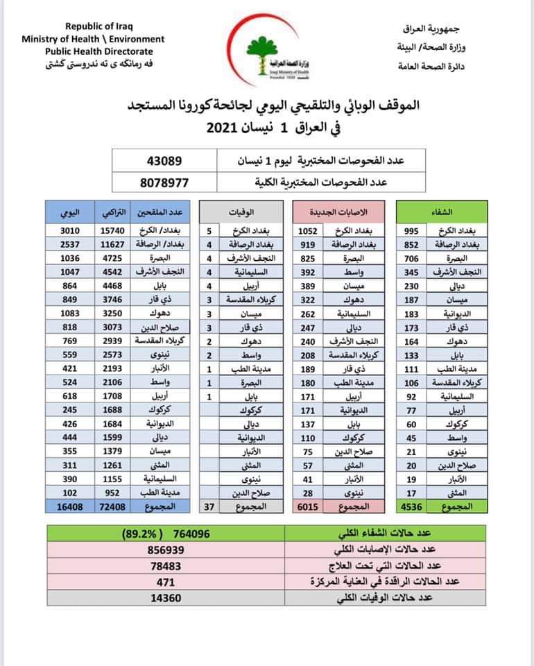 عراقيون/متابعة/ أعلنت وزارة الصحة والبيئة الموقف الوبائي والتلقيحي اليومي لجائحة لجائحة كورونا في العراق ليوم الخميس الموافق ١ نيسان ٢٠٢١.
