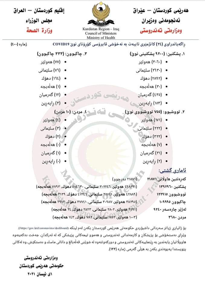 عراقيون/متابعة/ أعلنت وزارة الصحة في إقليم كوردستان الموقف الوبائي اليومي لفيروس كورونا اليوم الخميس.