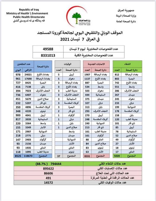 وذكرت الصحة في بيان حصلت وكالة انباء عراقيون على نسخة منه “تم تسجيل 8331 اصابة ،5020 حالة شفاء ، و37 حالة وفاة”.