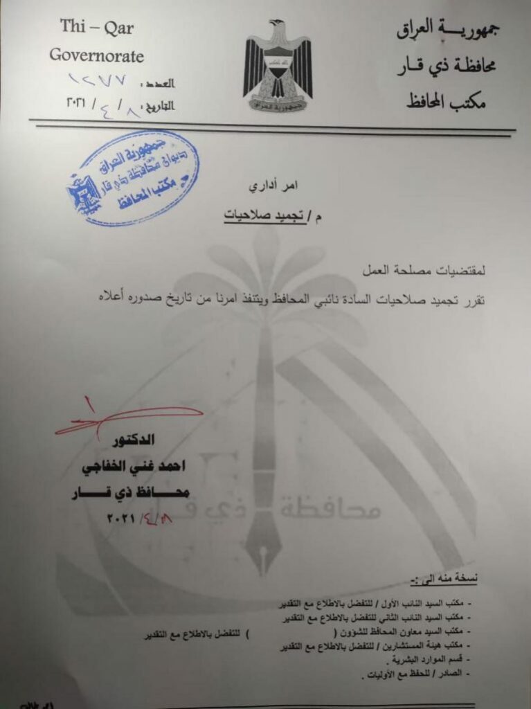 Posted in أهم الأخبار سياسـة شؤون محليةمحافظ ذي قار يجمّد صلاحيات نائبيه(وثيقة)by iraq•8 أبريل، 20218 أبريل، 2021•0 iraq More by iraq