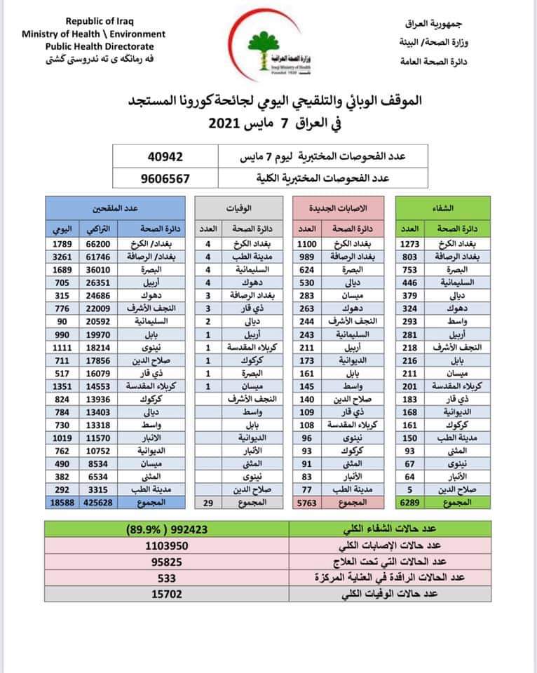 وذكرت الصحة في بيان حصلت وكالة أنباء عراقيون على نسخة منه “تم تسجيل 5763 إصابة جديدة ، و6289 حالة شفاء ، و29 حالة وفاة”.