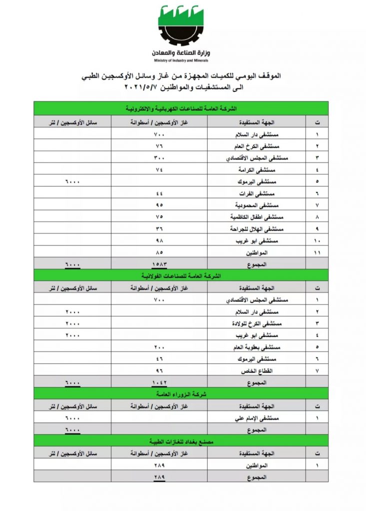 عراقيون/متابعة/ اعلنت وزارة الصناعة والمعادن الموقـف اليومـي للكميـات المُجهـزة مـن غـاز وسائـل الأوكسجيـن الطبـي إلـى المُستشفيـات والمواطنيـن .