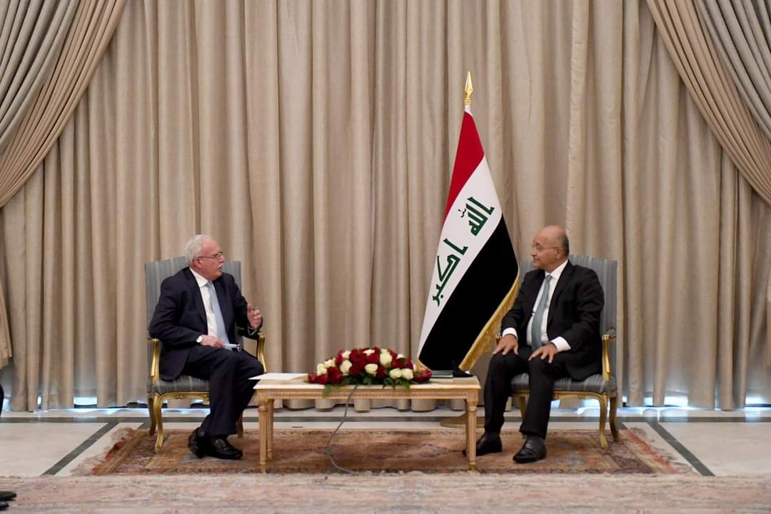 عراقيون /متابعة/ تسلم رئيس الجمهورية برهم صالح اليوم الأحد رسالة خطية من الرئيس الفلسطيني محمود عباس محملة مع وزير الخارجية الفلسطيني رياض المالكي في قصر السلام ببغداد.