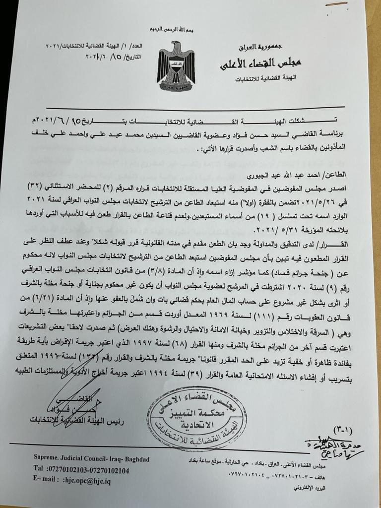 وأوضح الكتاب، أن “القضاء وجد أن شروط استبعاد (ابو مازن) لم تتحقق ضمن وقائع اضبارة الشكوى الخاصة بالمرشح، وهو ما جعل قرار مجلس المفوضين باستبعاد (ابو مازن) مخالف للأصول وأحكام القانون”