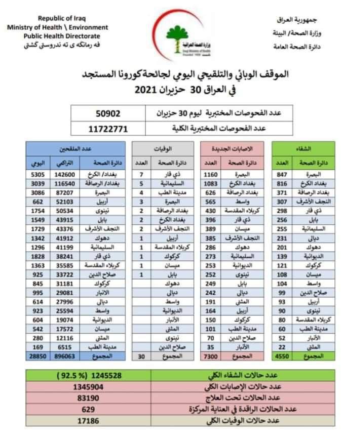 وقالت الوزارة في بيان تلقت/عراقيون/ نسخة منه ” سجلنا 7300 إصابة جديدة بفايروس كورونا مقابل 4550 حالة شفاء و 30 حالة وفاة موزعة على المحافظات العراقية بينها مدن إقليم كردستان.