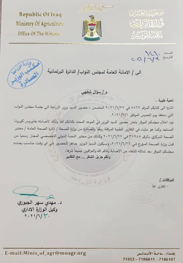 وذكرت وثيقة صادرة عن الوزارة ، أنه “يتعذر على وزير الزراعة الحضور في الموعد المحدد ضمن جدول أعمال مجلس النواب ليوم غد، وذلك لإصابته بفيروس كورونا المستجد”.