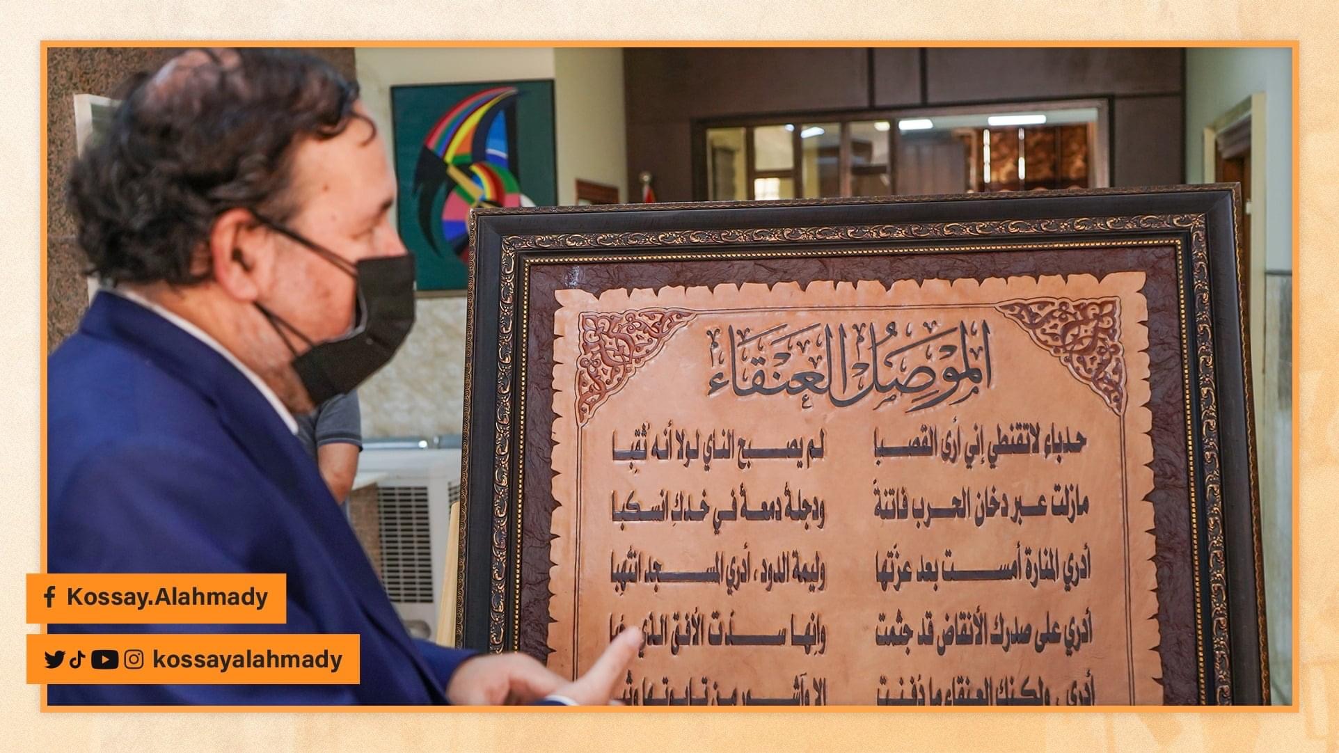 (حدباءُ لا تقنطي إني أرى القصبا)…هذه القصيدة الرائعة “الموصل العنقاء” سُطرت على صحيفة من الجلد بعمل الفنان التشكيلي المبدع عماد الحائك، لتكون شاخصة في مدخل رئاسة جامعة الموصل نعم يا مدينتي الحبيبة الحدباء لا تقنطي رغم كل الألم ستعودين شامخة “