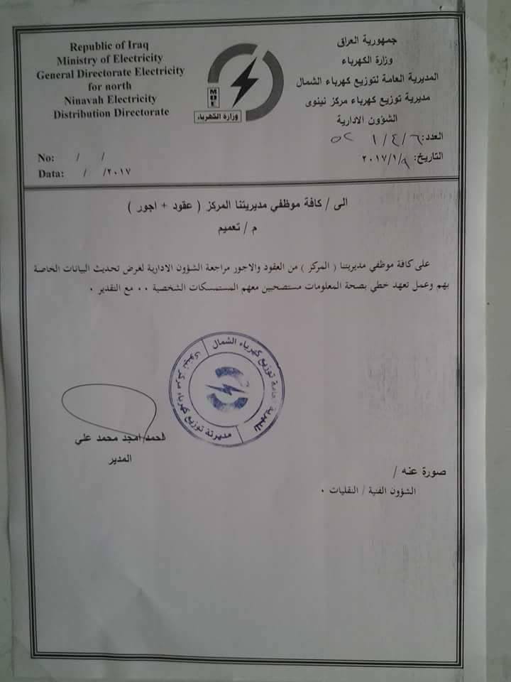 دعت مديرية توزيع كهرباء مركز نينوى موظفيها المتواجدين خارج المناطق المحاصرة في الموصل الى الالتحاق بمقر الدائرة شرقي الموصل لتحدثيت معلوماتهم.