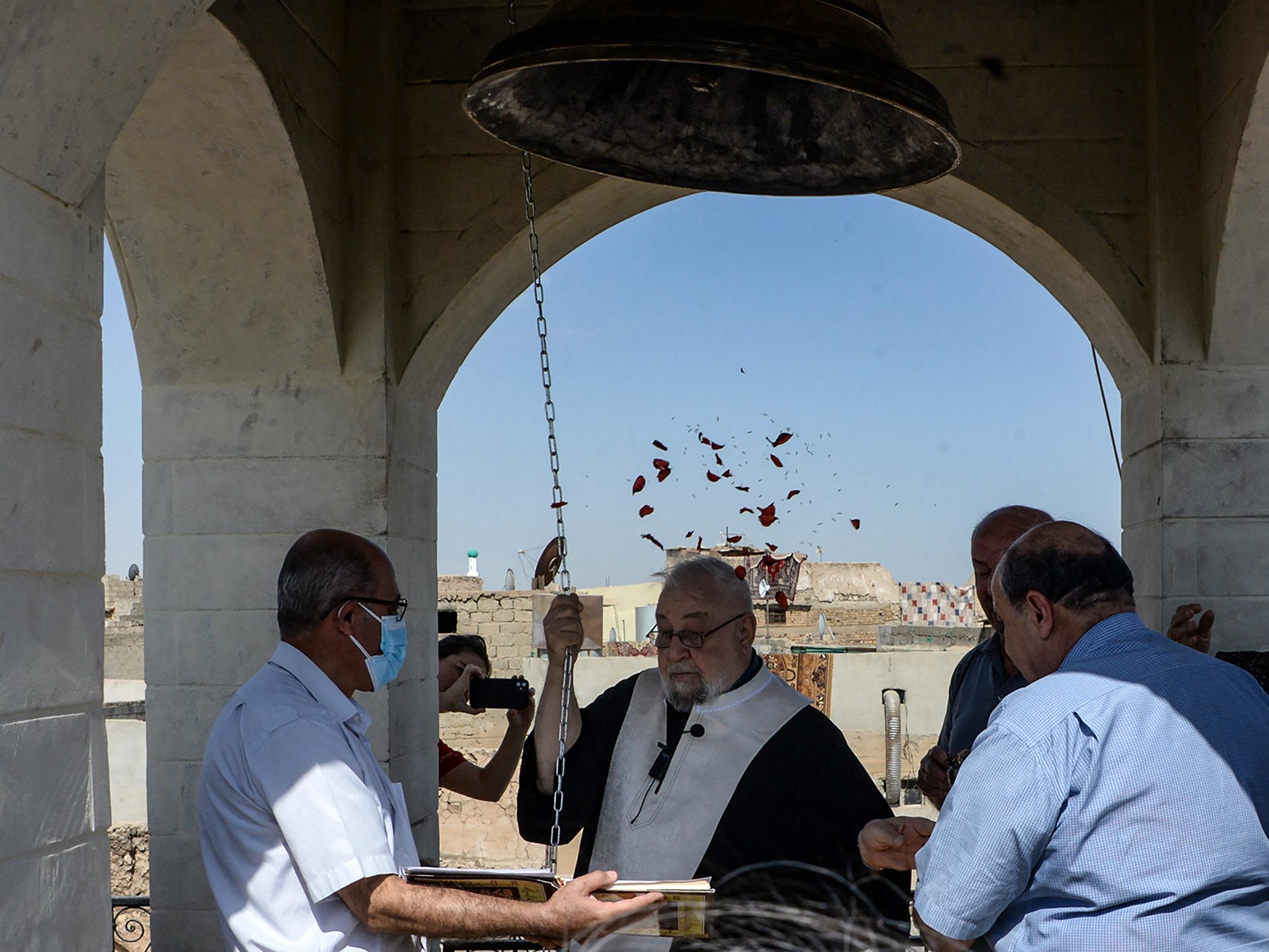 أمام عشرات الأشخاص، أغلبهم من المسيحيين الذين قدموا من المناطق المجاورة، قرع الأب بيوس عفاص الجرس في كنيسة السريان الكاثوليك التي ما زالت أعمال الترميم جارية فيها، بحسب وكالة فرانس برس.