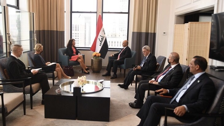 وأشار الرئيس برهم صالح، بحسب البيان، إلى أن “العراق يتطلع لتعزيز أمنه واستقراره، والعمل على ضرورة ضمان النزاهة والعدالة في الانتخابات المقرر إجراؤها في 10 تشرين الأول المقبل، مشيراً إلى أن العراق يتطلع قدماً نحو تعزيز الأمن والاستقرار في المنطقة والتنسيق مع المجتمع الدولي لتحقيق ذلك”.