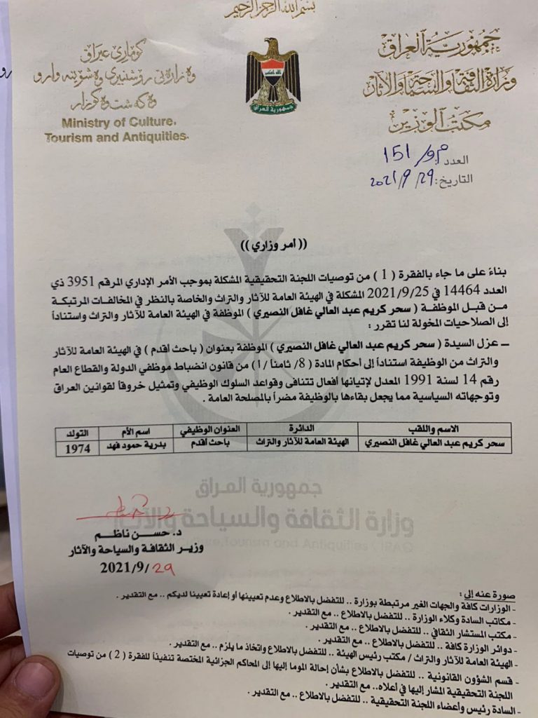ووفق كتاب رسمي صادر عن مكتب وزير الثقافة حسن ناظم وتضمن عزل “سحر كريم” من وظيفتها بعنوان (باحث أقدم)، وذلك طبقاً لأحكام قانون انضباط موظفي الدولة والقطاع العام، لـ”اتيانها بأفعال تتنافى مع السلوك الوظيفي”.