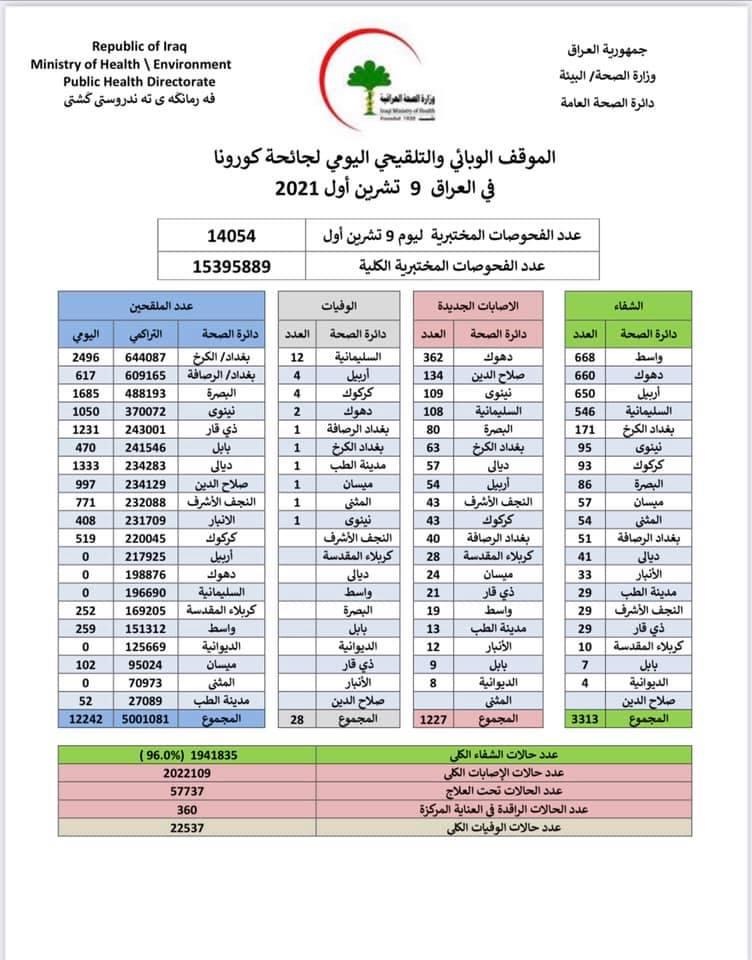 وقالت الوزارة في بيان إن “الكوادر الصحية سجلت 1227 إصابة جديدة في عموم المحافظات العراقية، فيما تماثل 3313 مصاباً إلى الشفاء، وقابل ذلك وفاة 28 مصاباً خلال المدة المذكورة”.