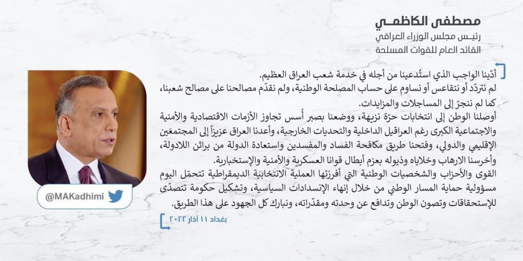 الكاظمي اضاف، “أوصلنا الوطن الى انتخابات حرة ونزيهة ووضعنا بصبر أسس تجاوز الأزمات الاقتصادية والأمنية والاجتماعية الكبرى رغم العراقيل الداخلية والتحديات الخارجية وأعدنا العراق عزيزاً الى المجتمعين الاقليمي والدولي ،وفتحنا طريق مكافحة الفساد والمفسدين واستعادة الدولة من براثن اللادولة ،وأخرسنا الإرهاب وخلاياه وذيوله بعزم أبطال قواتنا العسكرية والأمنية والاستخبارية”