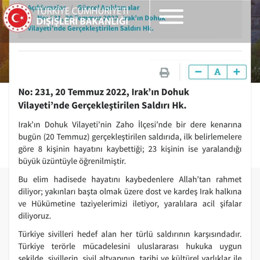 الخارجية التركية: نشعر بالحزن لمقتل 8 وإصابة 23 في غارة جوية على محافظة دهوك العراقية