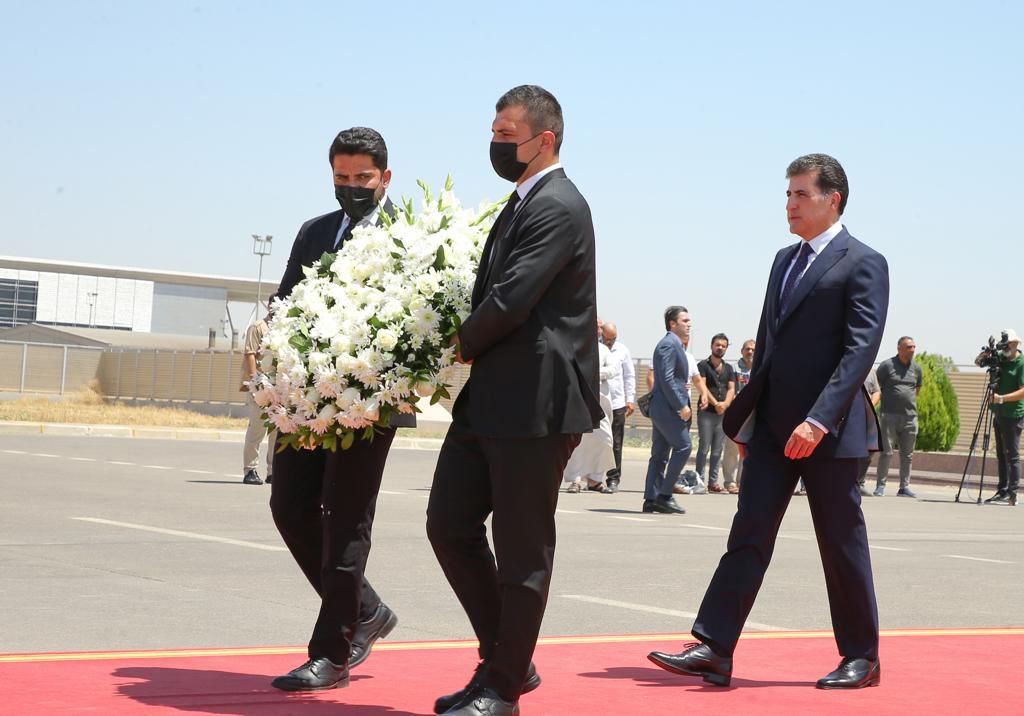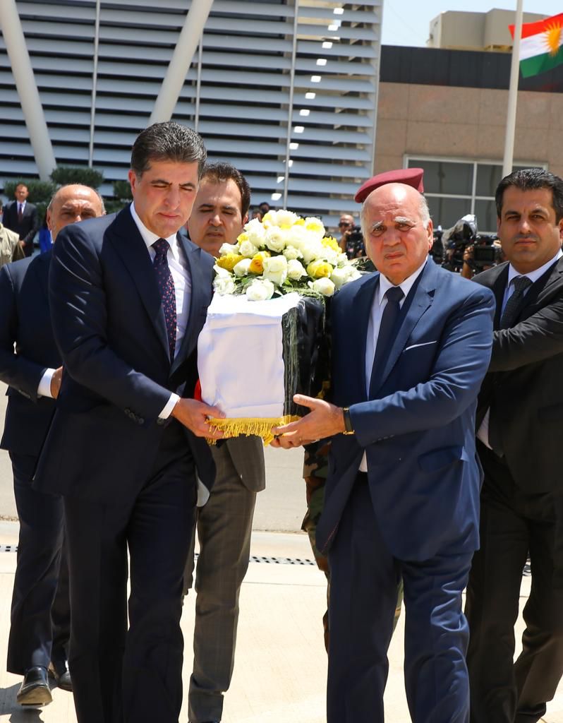 عراقيون/ متابعة/ شارك رئيس إقليم كوردستان “نيجيرفان بارزاني”، اليوم الخميس، 21 تموز 2022، في مراسم توديع جثامين شهداء قصف يوم أمس في زاخو، التي جرت في مطار أربيل الدولي، حيث تم نقلها بطائرة عسكرية إلى بغداد.