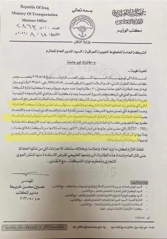وأضافت الوثيقة المذيلة بتوقيع مدير مكتب الوزير حسين محسن أن هذا الأمر “سيؤثر سلباً على عمل الشركة وأدائها واستغلال هذه الطائرات لغرض رفع المستوى المالي التي يفترض أن تحققها الطائرات للشركة وكذلك على جدولة حركة الطائرات وخدمة الخطوط التي تعمل عليها الشركة”.