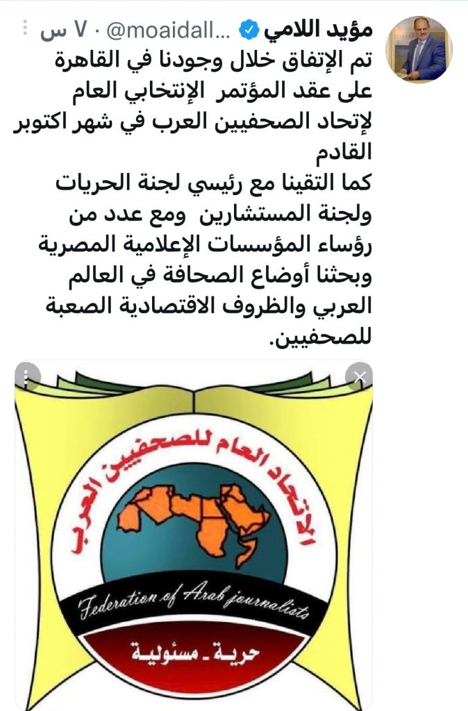 وقال اللامي في تغريدة له على منصة التويتر تابعتها /عراقيون/ انه “تم الإتفاق خلال وجودنا في القاهرة على عقد المؤتمر الإنتخابي العام لإتحاد الصحفيين العرب في شهر اكتوبر القادم”